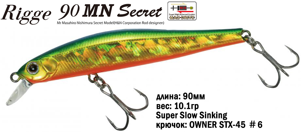 Rigge 90MN Secret представлен в супер медленно тонущем исполнении, что позволит соблазнять даже самых пассивных хищников, а Rigge 90MNS-LDS (Rigge MN Secret-Long Distance Thinking) является тонущим воблером, но его особенность кроется в беспрецедентной дальности полета, что позволяет использовать приманку в условиях сильного сезонного ветра. Модель Rigge 90MNS-LDS немного тяжелее своего предшественника Rigge 90MN Secret: 13 грамм против 10.