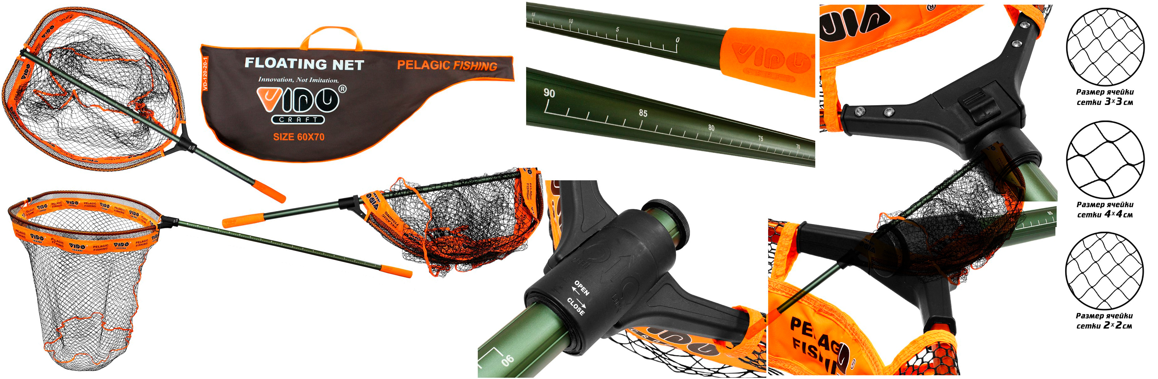Складной подсак Vido Craft комплектуется достаточно глубокой сеткой, которая надежно удерживает рыбу. Нередко при использовании подсаков с неглубокой сеткой сильная и мощная рыба, оказавшись в ней, может выпрыгнуть, что практически всегда сопровождается потерей приманки или оснастки.