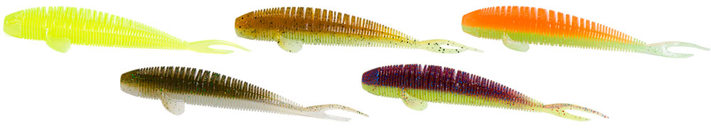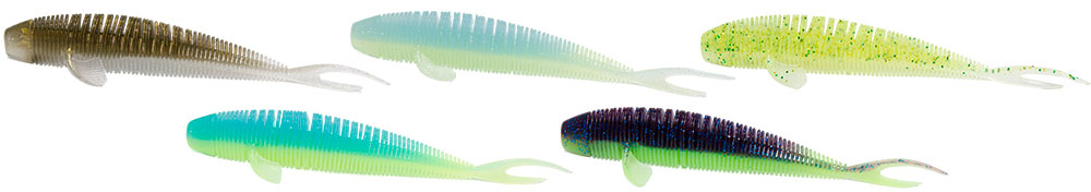 Подвижные реалистичные плавнички и асимметричный V-образный хвост, у которого верхняя часть длиннее нижней также добавляют “жизни” приманке. При равномерной проводке хвост плавно колеблется из стороны в сторону. Хвост ориентирован вертикально. Такая ориентация показала себя более эффективно во время тестов этой приманки