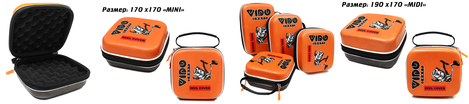 Чехол выполнен в ярком оранжевом цвете, что делает его заметным и легко узнаваемым среди других рыболовных принадлежностей. На верхней части чехла нанесен логотип бренда Vido Craft и надпись "REEL COVER", что подчеркивает его назначение. Также на крышке изображена рыболовная катушка, что добавляет эстетическую привлекательность.