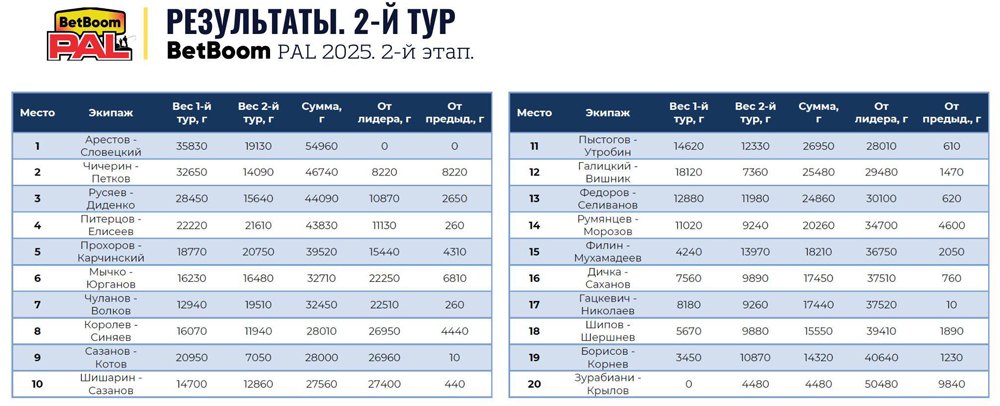 Экипаж Максим Арестов и Евгений Словецкий — лидеры после 2-х туров Финального этапа BetBoom PAL 2025! Их результат составил 54 килограмм 960 грамм!