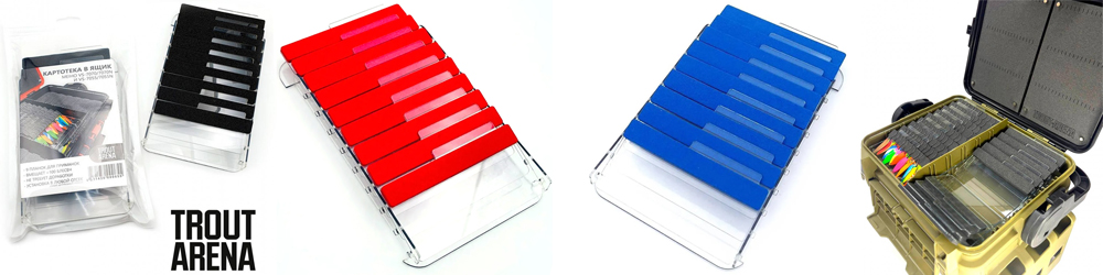 Картотека Trout Arena вмещает в себя 9 кассет для хранения блесен. Вместимость одной кассеты от 10 до 15 блесен (зависит от размера блесен и размещения). Картотека может располагаться в любой ячейке ящика 7070, и также легко перемещаться между отсеками. Ничего подпиливать, сверлить и дорабатывать не нужно — купил, установил, повесил блесна и на рыбалку!