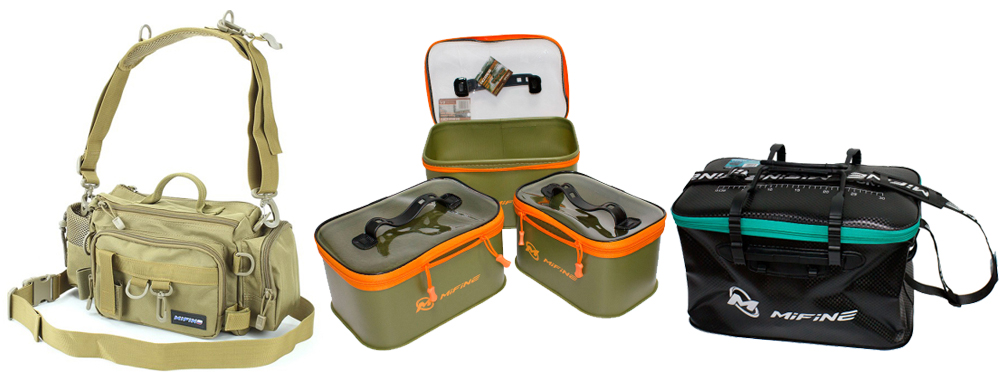 Рыболовные сумки Mifine имеют верхнюю крышку из жесткого пластика, за счет чего сумка может использоваться как стол или стул. Каркас у моделей жесткий, что позволяет без риска перевозить деликатные удочки в сложенном состоянии и катушки. С внешней стороны находятся 4 стакана-держателя для удилищ. Объем жестких сумок – до 45л. Большие пластиковые ручки и регулируемая наплечная лямка удобны даже для людей, одетых в зимнюю экипировку.