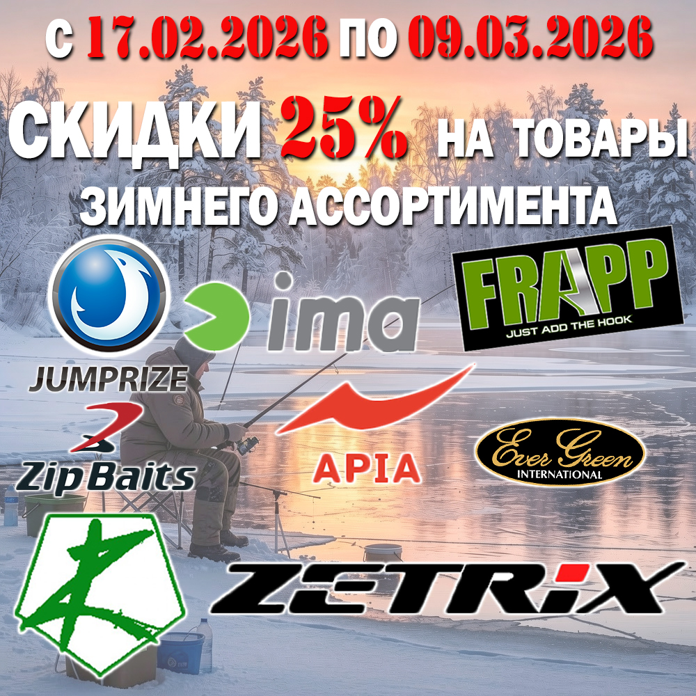 Уважаемые любители зимней рыбалки! Наш интернет магазин предоставляет до 9 марта СКИДКУ 25% на товары из зимнего ассортимента популярных брендов! Это вибы Frapp, EverGreen Marvie, Jumprize ChataBee, IMA Koume, ZipBaits Rigge Vib, Apia Uprizing и Bit-V, зимние удочки и катушки Zetrix.