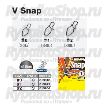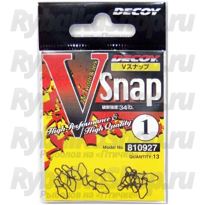 Decoy V-Snap – карабин, специально спроектированный для приманок, требующих рывковую проводку, особенно воблеров с нейтральной плавучестью. Благодаря тонкой проволоке и, следовательно, малому весу, застежки - не нарушается балансировка даже идеально выверенных «суспендеров», а специальная, немного угловатая форма позволяет достичь высокой прочности.