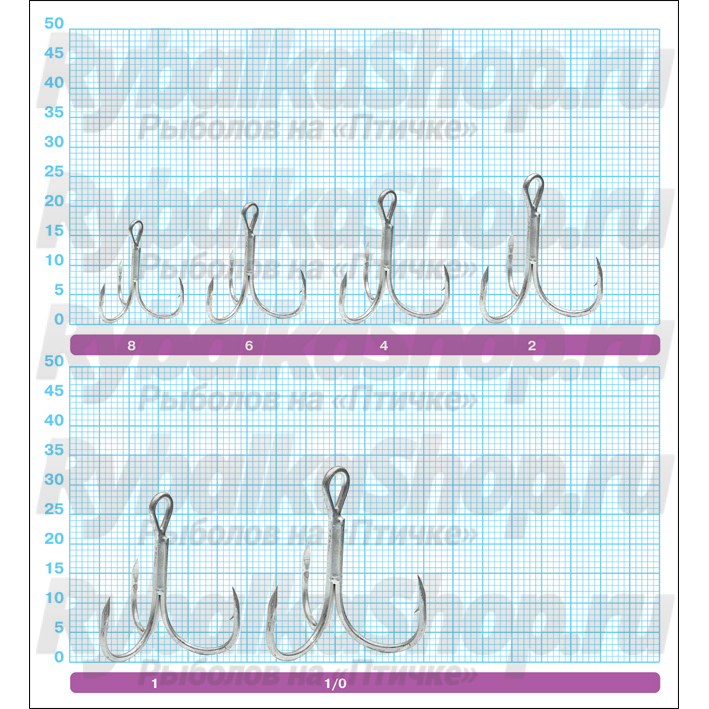К характерным особенностям тройников относятся продолговатый изгиб, чуть удлиненное цевье, самая совершенная заточка Cutting Point® , прочное никелевое покрытие или покрытие Black Chrome.