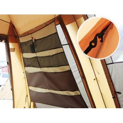 Вход в спальное помещение так же защищен противомоскитной сеткой и ветро/влагозащитной стенкой. На стенках внутренней палатки пришиты кармашки для мелких вещей. В центре купола внутренней палатки есть крючок для подвешивания ламы или фонаря. При необходимости вы можете поставить в тамбуре палатки столик и стулья. В жаркую погоду вы будете комфортно отдыхать в тени. В то же время материалы, из которых изготовлена палатка, надежно защитят вас от непогоды. Даже в случае продолжительного дождя тент палатки не промокнет и внутри будет сухо и комфортно. По низу тента палатки пришита ветрозащитная юбка. Собирается данная модель очень легко. Сначала нужно расстелить тент и расшпилить его по четырем углам. В палатке есть три надувные дуги, каждая из которых имеет клапан для надувания и клапан для сдувания. Сами надувные трубы защищены чехлами из мощного армированного материала, так что проколоть или прорезать их случайно у вас не получится. При помощи насоса, который идет в комплекте или используя компрессор от машины накачать сначала дугу тамбура. После этого накачать поочередно центральную дугу и дугу спального помещения. После этого вам остается окончательно укрепить палатку при помощи оставшихся шпилек и установить ветровые растяжки. Подвесьте спальное помещение и палатка готова к использованию.
