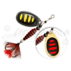 Лепесток блесны прежде всего отличается своим декором - он двусторонний и к тому же еще и реверсивный. При вращении лепестка удалось добиться оригинального эффекта, близкого к объемному изображению. Хищник видит мельтешащий, провоцирующий рисунок лепестка под любым углом обзора. Это ли не повод для атаки? Строение сердечника. Он наборный, состоящий из нескольких шариков разного диаметра. Именно за счет сердечника центр тяжести блесны несколько иной, он чуть смещен к задней части тела, что положительно сказывается на дальности и точности заброса.