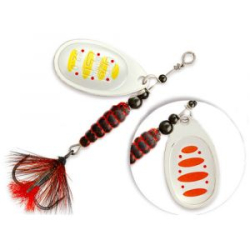 Лепесток блесны прежде всего отличается своим декором - он двусторонний и к тому же еще и реверсивный. При вращении лепестка удалось добиться оригинального эффекта, близкого к объемному изображению. Хищник видит мельтешащий, провоцирующий рисунок лепестка под любым углом обзора. Это ли не повод для атаки? Строение сердечника. Он наборный, состоящий из нескольких шариков разного диаметра. Именно за счет сердечника центр тяжести блесны несколько иной, он чуть смещен к задней части тела, что положительно сказывается на дальности и точности заброса.