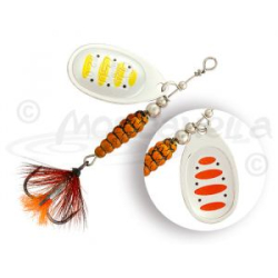 Лепесток блесны прежде всего отличается своим декором - он двусторонний и к тому же еще и реверсивный. При вращении лепестка удалось добиться оригинального эффекта, близкого к объемному изображению. Хищник видит мельтешащий, провоцирующий рисунок лепестка под любым углом обзора. Это ли не повод для атаки? Строение сердечника. Он наборный, состоящий из нескольких шариков разного диаметра. Именно за счет сердечника центр тяжести блесны несколько иной, он чуть смещен к задней части тела, что положительно сказывается на дальности и точности заброса.