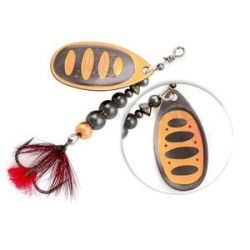 Лепесток блесны прежде всего отличается своим декором - он двусторонний и к тому же еще и реверсивный. При вращении лепестка удалось добиться оригинального эффекта, близкого к объемному изображению. Хищник видит мельтешащий, провоцирующий рисунок лепестка под любым углом обзора. Это ли не повод для атаки? Строение сердечника. Он наборный, состоящий из нескольких шариков разного диаметра. Именно за счет сердечника центр тяжести блесны несколько иной, он чуть смещен к задней части тела, что положительно сказывается на дальности и точности заброса.
