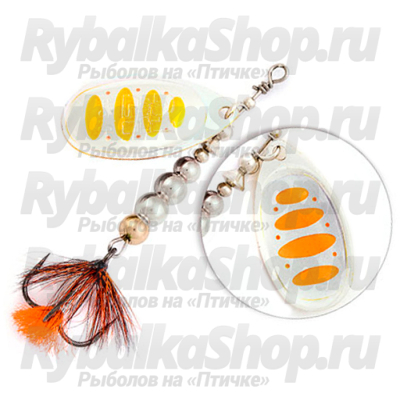 Лепесток блесны прежде всего отличается своим декором - он двусторонний и к тому же еще и реверсивный. При вращении лепестка удалось добиться оригинального эффекта, близкого к объемному изображению. Хищник видит мельтешащий, провоцирующий рисунок лепестка под любым углом обзора. Это ли не повод для атаки? Строение сердечника. Он наборный, состоящий из нескольких шариков разного диаметра. Именно за счет сердечника центр тяжести блесны несколько иной, он чуть смещен к задней части тела, что положительно сказывается на дальности и точности заброса.
