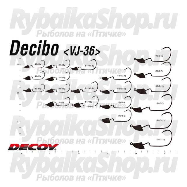 Decoy Decibo VJ-36 – Джиг-головка, на первый взгляд, выглядящая как оснастка из отдельно взятого оффсетного крючка и груза-пули. Но это не так. Она состоит из пулевидного грузила с впаянным в него оффсетным крючком увеличенного размера.