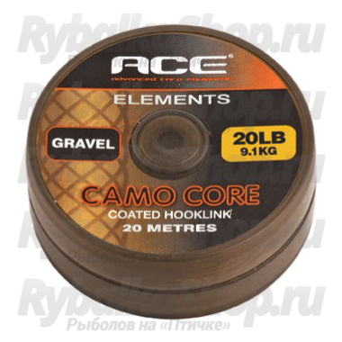 ACE Camo Core - Gravel 20m - быстротонущий поводковый материал английской компании "ACE". Имеет высокую стойкость к истиранию. Легко вяжется. Благодаря камуфлированному цвету обеспечивает отличную маскировку в водоемах с гравийным дном. Поставляется в размотках по 20 метров, в удобной пластиковой упаковке.