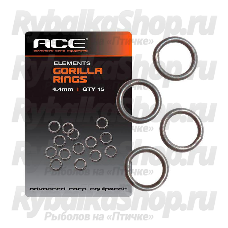 ACE Gorilla Rings - набор японских колец для изготовления противовыбрасывающих оснасток от английской компании "ACE". Имеют тусклый матовый цвет и не создают бликов, что обеспечивает лучшую маскировку и не отпугивает осторожную рыбу. Диаметр кольца 4,4 мм. Упаковка содержит 15 штук колец. Поставляется в блистерной упаковке.