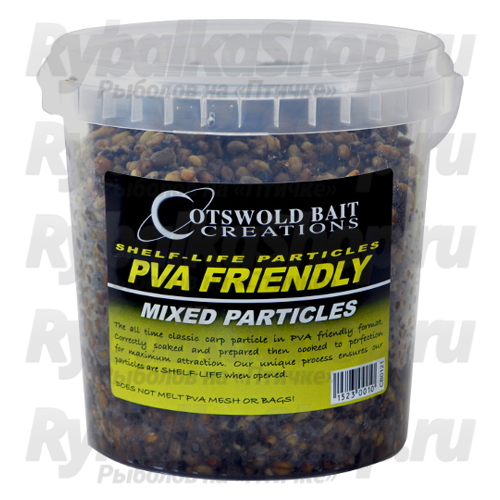COTSWOLD BAITS PVA FRIENDLY PARTICLES - уникальные зерновые прикормки не растворяющие ПВА! Все элементы тщательно отбираются и проходят проверку. Уникальный процесс приготовления гарантирует, что PVA Friendly Particles не растворяют ПВА мешки и сетки, насыщают место прикормки аттрактивными веществами и остаются свежими, даже после вскрытия упаковки.