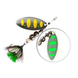 Лепесток блесны изготовлен в форме "ивового листа" и отличается своим декором – он двусторонний и к тому же еще и реверсивный. При вращении лепестка удалось добиться оригинального эффекта, близкого к объемному изображению. Хищник видит мельтешащий, провоцирующий рисунок лепестка под любым углом обзора. Это ли не повод для атаки?
