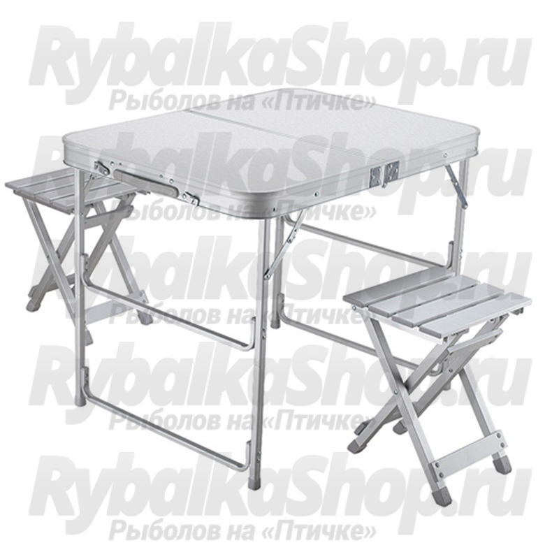 Набор из складного стола и двух стульев. Стулья складываются и убираются вовнутрь стола, который в собранном виде имеет форму чемодана. Компактный складной стол, изготовленный из алюминия. Конструкция представляет собой удивительную дизайнерскую идею: в комплект входят два стула, а в собранном виде стол выглядит как чемодан, пластиковая поверхность которого легко чистится и почти не царапается.