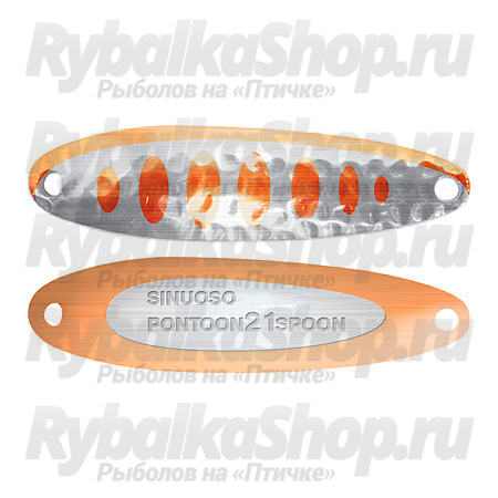 Pontoon21 Sinuoso Spoon - узкотелые колеблющиеся блесна с изогнутым профилем в хвостовой части с двусторонним рисунком и рифленой поверхностью. Внешняя сторона приманки, выполненная в виде рельефной поверхности с нанесенным на нее рисунком, способствует дополнительному привлечению хищника.