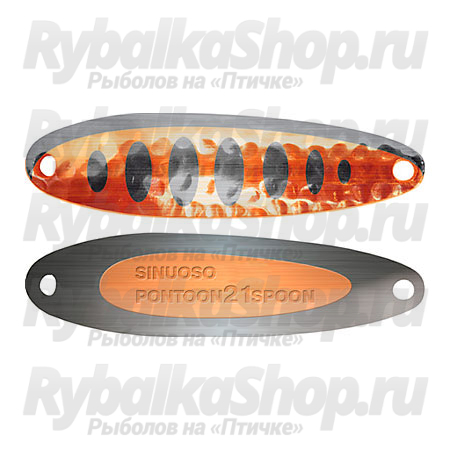Pontoon21 Sinuoso Spoon - узкотелые колеблющиеся блесна с изогнутым профилем в хвостовой части с двусторонним рисунком и рифленой поверхностью. Внешняя сторона приманки, выполненная в виде рельефной поверхности с нанесенным на нее рисунком, способствует дополнительному привлечению хищника.