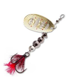 За счёт идеально подобранного размера тройника и лепестка, а также частоты вращения последнего, блесну можно смело забрасывать в траву, не боясь её оторвать, т.к. лепесток отбивает траву, не давая тройнику зацепиться. Прочный острый тройник оснащен мушкой, что положительно сказалось при ловле окуней, форели и жереха. Щуке также интересна эта приманка и она охотно ей атакует.