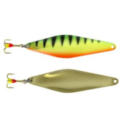 Преимущество литых латунных блесен перед точеными блеснами ручной работы состоит в том, что материал имеет большую жесткость, чем свинец, серебро и медь и даже в самых тонких частях легкой блесны он не подвержен изгибаниям и изломам. Тройник данной приманки оснащен яркой мухой из козьей шерсти. Она выполняет роль «точки атаки» для хищника и помогает снизить количество пустых поклевок.