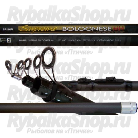Salmo Supreme Bolognese MH - Телескопическое удилище среднего строя из композита. Верхние два колена бланка удилища изготовлены из графита IM6, а остальные колена - из облегченного стекловолокна. Такая комбинация позволила уменьшить вес удилища, тейперь его легче стало держать в руках продолжительное время. Удилище укомплектовано облегченными кольцами SIC, на верхнем колене имеется дополнительное разгрузочное кольцо, установлен быстродействующий катушкодержатель типа Clip Up.