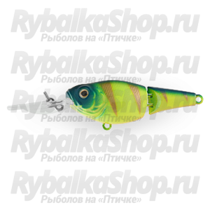 Составной воблер Strike Pro Bobcat имеет довольно толстое, каплевидное тело с зауженным хвостом. Фирменное соединение Strike Pro “велосипедная цепь” делает тело воблера очень подвижным, в то же время очень прочным. Воблер оснащен длинной вытянутой лопастью, расположенной под углом 10 градусов к оси приманки. На ней расположено колечко для крепления лески. Внутри тела приманки расположена низкочастотная погремушка с металлическими шариками.