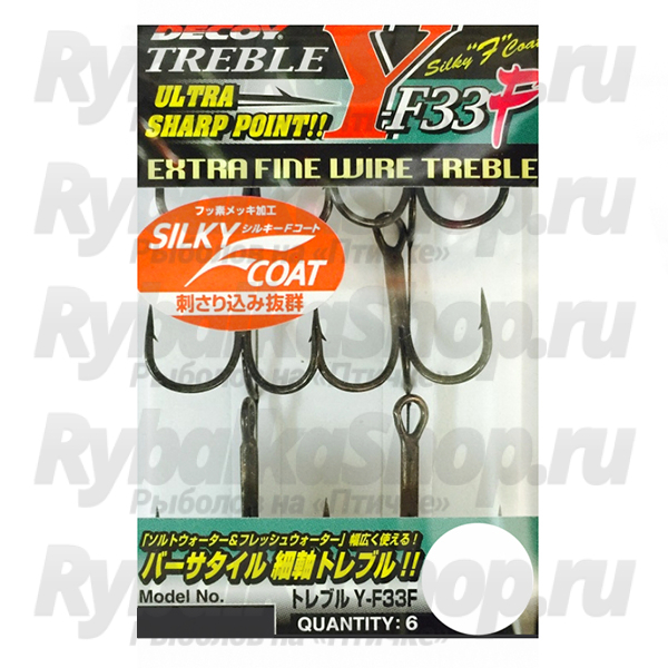 Decoy Y-F33F — изготовленны из тонкой и упругой проволоки. Они имеют длинное цевье, классический загиб и фторсодержащее покрытие, благодаря которому поверхность крючка очень гладкая, что способствует более легкому проникновению в костистую пасть рыбы. Ушко изготовлено по технологии «smart eye» и легко оснащается заводными кольцами.