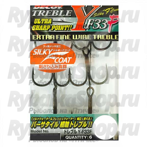 Decoy Y-F33F — изготовленны из тонкой и упругой проволоки. Они имеют длинное цевье, классический загиб и фторсодержащее покрытие, благодаря которому поверхность крючка очень гладкая, что способствует более легкому проникновению в костистую пасть рыбы. Ушко изготовлено по технологии «smart eye» и легко оснащается заводными кольцами.