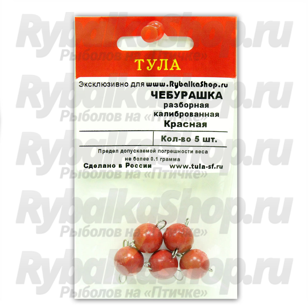 Груз Чебурашка (спорт) предлагается в широчайшем диапазоне веса: от 1 до 100 грамм. Груза весом до 12 грамм включительно - упакованы в пакет, свыше 12 грамм - в блистер. В каждой упаковке независимо от веса находится по 5 чебурашек. Разборные грузы применяются для оснасток с офсетными крючками. Благодаря удачной конструкции "чебурашек", очень просто и быстро возможно осуществить как замену самого груза в оснастке, так и смонтированного офсетного крючка.