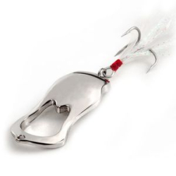 Уникальное строение блесны в сочетании изгибов в двух плоскостях и достаточно большого отверстия сложной формы в передней части позволяет произвести максимальный всплеск при вхождении в воду при таком довольно не значительном объеме . Опущенный и довольно утолщенный хвост приманки позволяет совершать преувеличенные но достаточно изящные колебания.