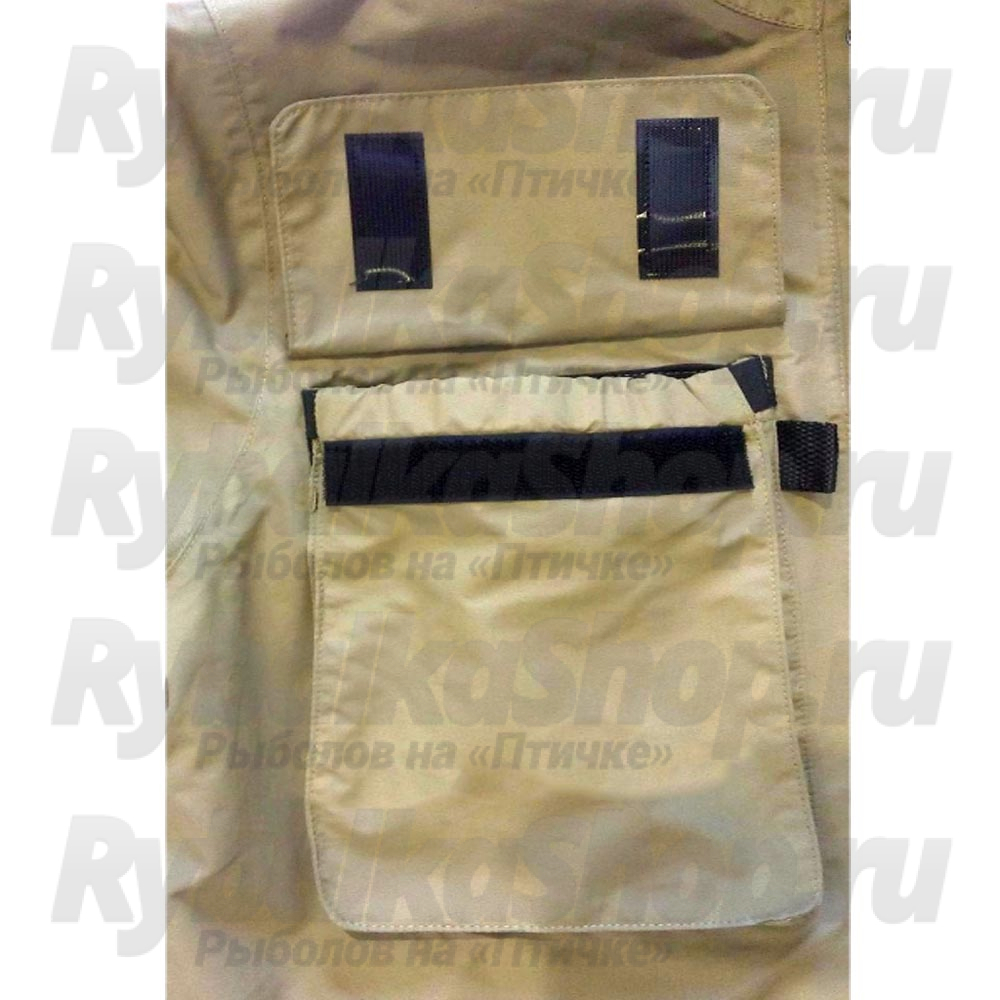 На груди большие объемные карманы, которые позволят разместить любимые приманки и другие необходимые предметы, сбоку дополнены петлями под ретривер. Карманы надежно закрываются клапаном с лентой "велкро". Под накладными карманами расположены карманы с боковым входом и быстросохнущим флисовым подкладом, в которых можно согреть руки.
