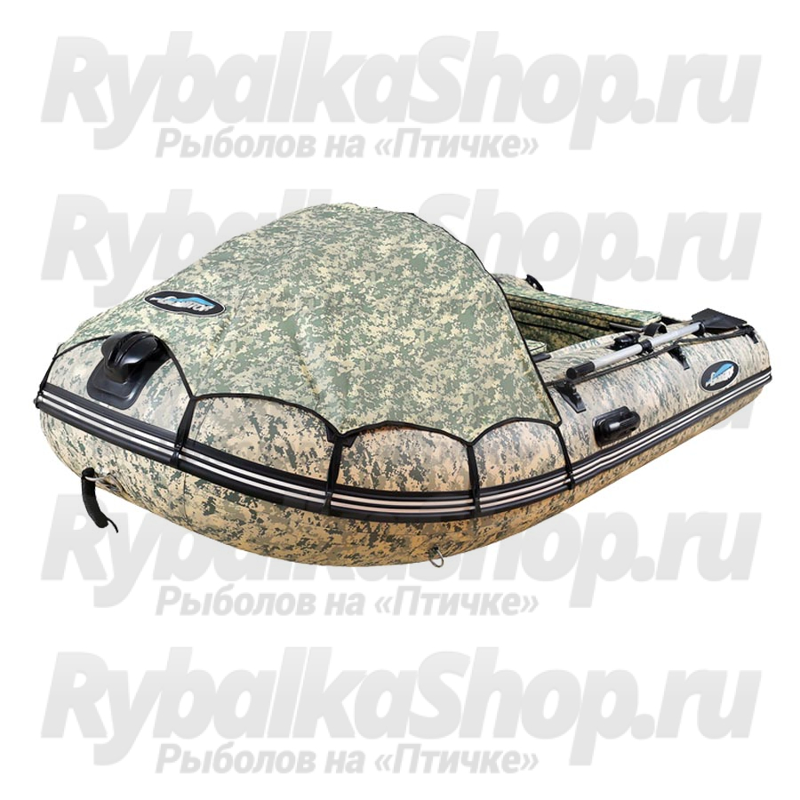 Тент с надувной дугой можно установить на носу лодки, под него помещается носовая сумка.