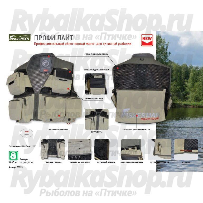 Летний жилет Fisherman Профи ЛАЙТ для рыбалки. Материал нейлон отталкивает влагу и грязь. Мягкий валик на воротнике - чтобы жесткий нейлон не натирал шею. Летний вариант, верхняя часть из сетки! Светлый материал отталкивает УФ-лучи. Укороченный крой удобен для забродной рыбалки.