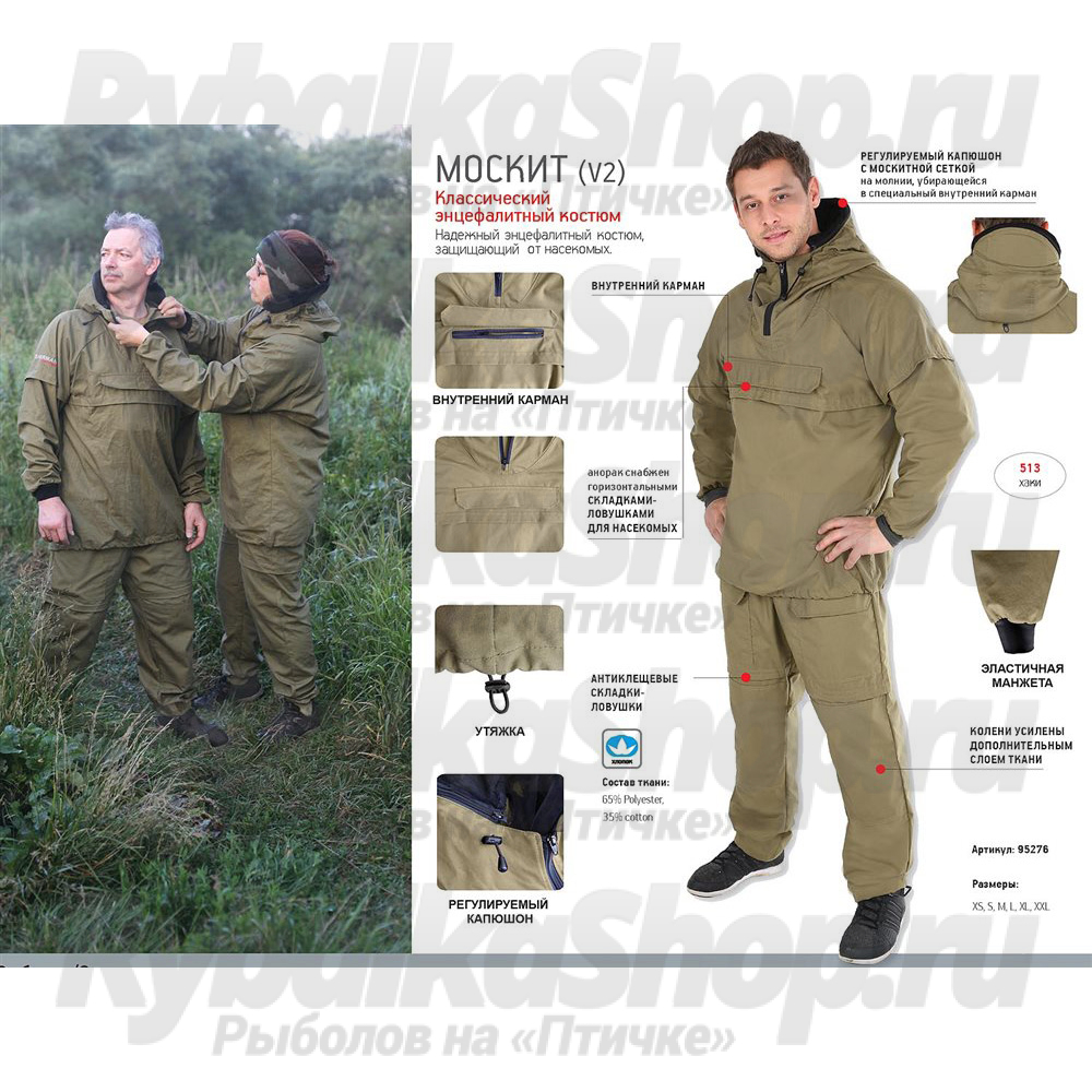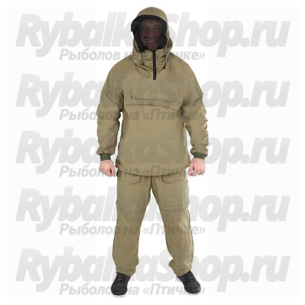 Надежный противоэнцефалитный костюм, защищающий от насекомых. Анорак снабжен горизонтальными складками-ловушками для насекомых, регулируемым капюшоном с москитной сеткой на молнии, убирающейся в специальный внутренний карман. На штанах два грузовых кармана, колени усилены дополнительным слоем ткани. Манжеты рукавов на резинке. На брюках имеются шлевки под ремень + резинка.