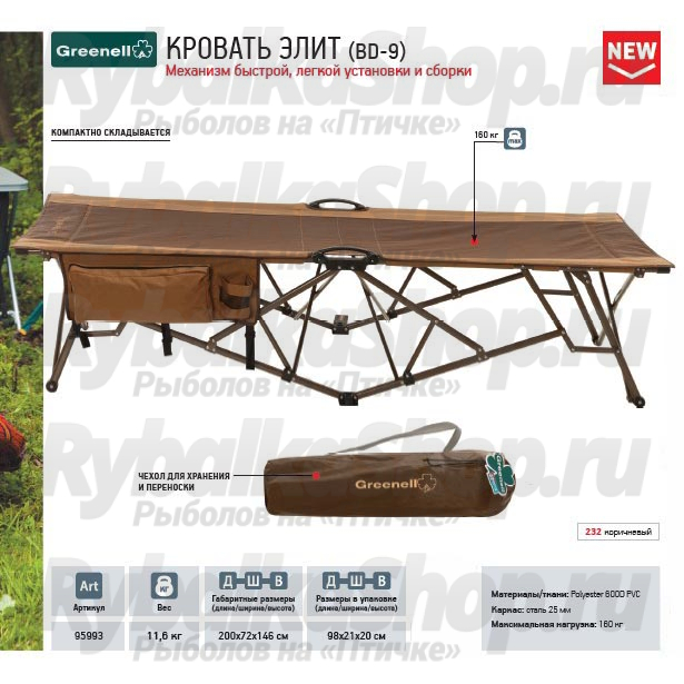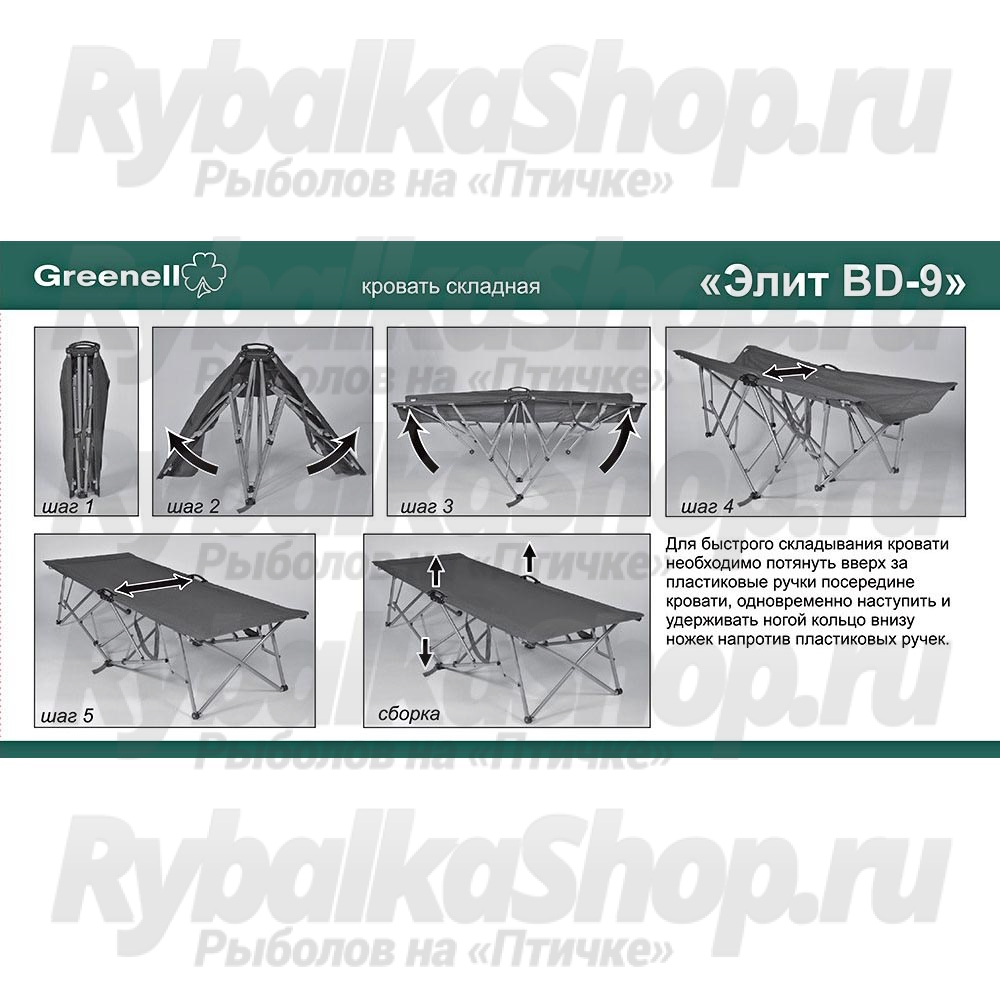 Складная туристическая кровать Greenell Элит BD-9 с алюминиевым каркасом. Предусмотрен надежный механизм быстрой, легкой установки и сборки. Складная кровать будет уместна на даче, отдыхе на природе в теплый летний день. Для перевозки и хранения предусмотрен удобный чехол.