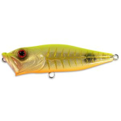 Корпус воблера TsuYoki Punch изготовлен на высоком уровне. Большая часть поверхности тела поппера имеет ромбические насечки, и лишь брюшко и небольшая часть бока - косые линии. Такая рельефная фактура весьма правдоподобно имитирует чешуйчатое тело. На голове хорошо прорисованы жаберные крышки. Также имеются два объемных глаза, которые усиливают сходство воблера TsuYoki Punch с настоящей рыбкой. Для большей реалистичности весь модельный ряд поппера выпускается в весьма оригинальных насыщенных окрасках, среди которых есть и бликующие покрытия.