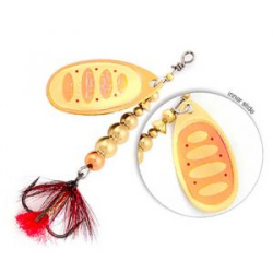 MEPPS AGLIA TW отличаются от базовой модели двухцветной рефлекторной окраской лепестка и возможностью быстрой замены тройника. Грузик сердечника у AGLIA TW имеет внутреннюю резьбу с очень крупным шагом. Проволочная ось завершается колечком для крючка, сопряженным с пружинной шпилькой. Находясь в теле груза, пружинная шпилька упирается в уступ крупной резьбы. В данном случае шестигранный грузик служит винтовым замочком. Освобождение шпильки осуществляется простым свинчиванием груза, а возвратная фиксация — вдавливанием шпильки в его тело. Это простой, но очень надежный узел крепления (не разрушается даже при значительных нагрузках). AGLIA TW — настоящий клад для любителей экспериментов на водоемах. Рыболов получает возможность быстро укомплектовать вращалку пластиковой рыбкой, виброхвостом, твистером или просто тройником с мухой подходящего цвета. Кроме того, это идеальный вариант для создания всевозможных тандемов из вращающихся блесен или для замены тройника на одинарный крючок с защитной петелькой при ловле на закоряженных участках водоемов. Цвета лепестков: серебряный, золотой и медный.