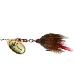 При вращении лепестка, благодаря цветным точкам наклеек и ее черной подложке, приманка напоминает крупное насекомое. Поскольку блесны оснащаются лепестками различных цветов, то всегда есть возможность выбора наиболее удачного сочетания. В одном случае, предпочтительней окажется яркая окраска, контрастирующая с окружающим фоном, в другом — «покровительственная», т.е. маскирующая (такой вариант очень эффективен при охоте за осторожной рыбой). Иногда бывает, что к успеху приводит чисто механический подбор цвета приманки, поскольку нет никаких видимых оснований для конкретного выбора. Часто в информационном материале MEPPS обращает внимание рыболовов на сходство окраски вращающихся блесен и водных объектов, таких как насекомые и мелкие рыбешки. В отношении последних, у опытных рыболовов существуют обоснованные сомнения. Весьма приблизительной имитацией рыбки, из вращающихся блесен, может служить лишь AGLIA LONG. В основном, это достоинство воблеров и колеблющихся блесен. Дело в том, что не только мирные, но и хищные рыбы в раннем периоде своего развития проходят насекомоядную стадию. Естественно, что рефлекторная память сохраняется очень долго, этим, вероятно, и объясняются феноменальные способности Mepps Black Fury №4.