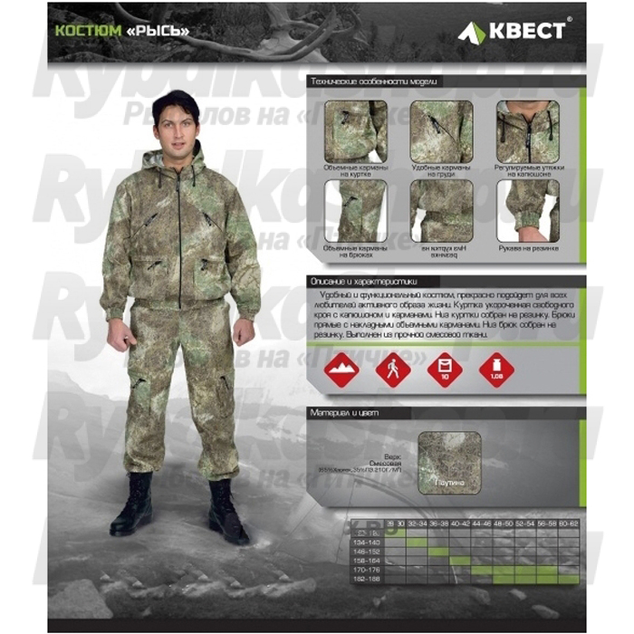 Смесовая ткань позволяет костюму быть практичным и удобным в эксплуатации. Костюм «Рысь» пользуется популярностью как у любителей активного отдыха, так и как надежный рабочий костюм.