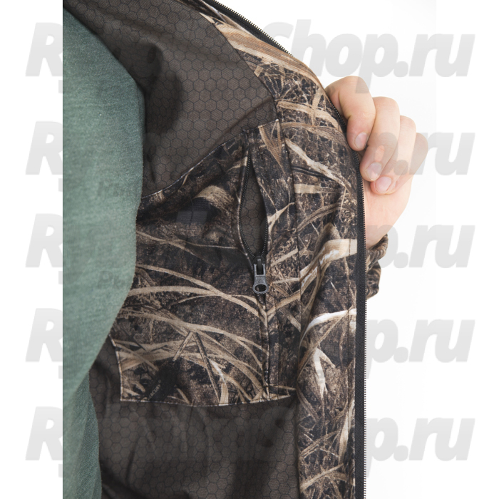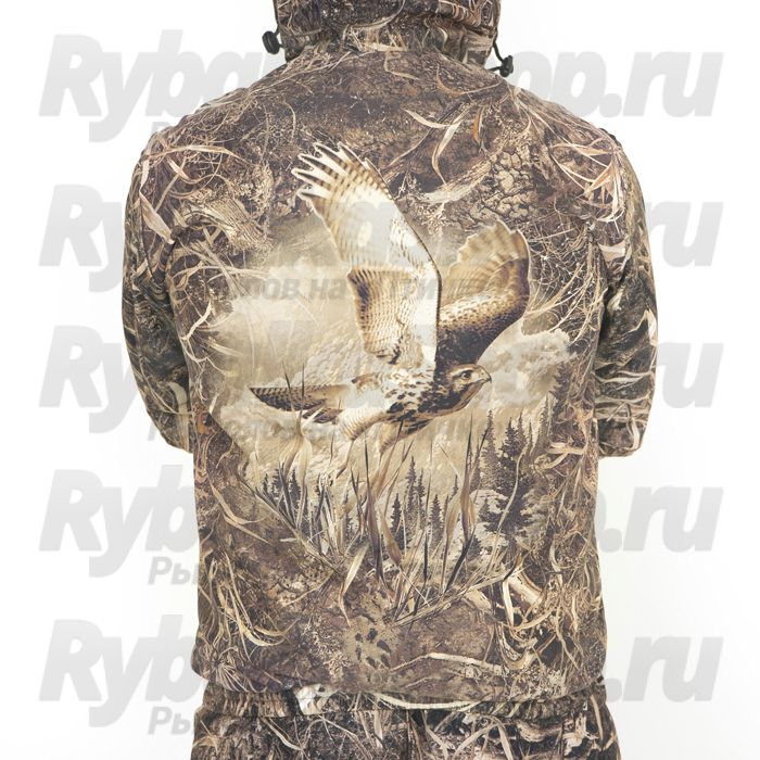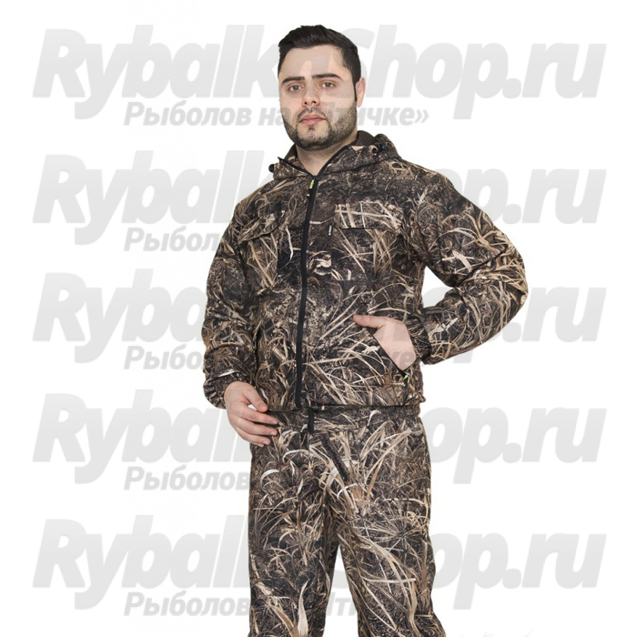 Куртка укороченная, застежка - «молния». Низ куртки и рукавов собраны на широкую резинку, которая обеспечивает комфортное прилегание и защищает от ветра. Благодаря мягкой, легкой и пластичной ткани двигаться в костюме легко и свободно. Ткань не шуршит – костюм идеально подходит для охоты, почти не промокает и пропускает испарения тела.