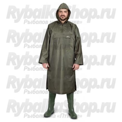 Длинный плащ защитит ноги от мокрой травы, а разрезы по бокам обеспечивают свободу движения. Документы и телефон можно поместить в карман на груди, который закрывается клапаном и убережет ценные вещи от намокания. Капюшон с уплотненным козырьком регулируется по ширине и по объему.