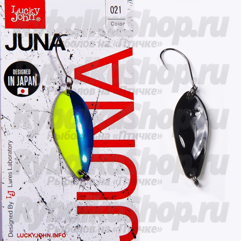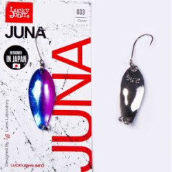 Juna  - новинка 2017 года - cерия колеблющихся блёсен, разработанная японскими специалистами по заказу компании Lucky John для любителей ловли прудовой форели. В отличии от модели Lucky John Cleoблесны Lucky John Juna имеют несколько более огруглую форму и большую площадь по отношению к весу приманки, что позволяет использовать её на самых малых скоростях, тем самым привлекая даже пассивного хищника. Блёсны Lucky John Juna по достоинству будут оценены также любителями ловли головля, окуня и некрупной щуки на спиннинговые снасти ультралёгкого класса. Оснащаются одинарным безбородочным крючком.