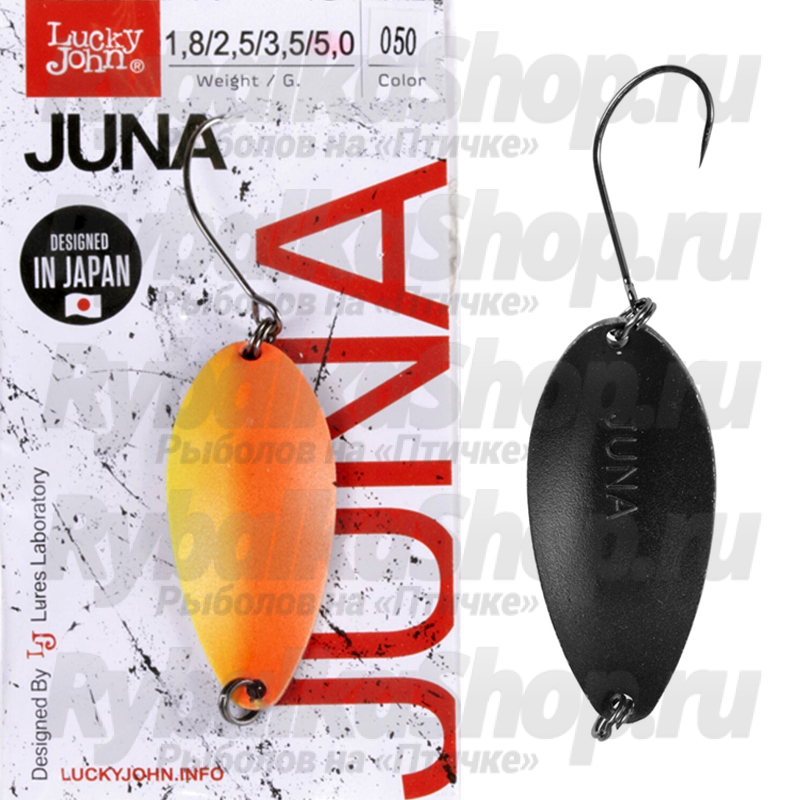 Juna  - новинка 2017 года - cерия колеблющихся блёсен, разработанная японскими специалистами по заказу компании Lucky John для любителей ловли прудовой форели. В отличии от модели Lucky John Cleoблесны Lucky John Juna имеют несколько более огруглую форму и большую площадь по отношению к весу приманки, что позволяет использовать её на самых малых скоростях, тем самым привлекая даже пассивного хищника. Блёсны Lucky John Juna по достоинству будут оценены также любителями ловли головля, окуня и некрупной щуки на спиннинговые снасти ультралёгкого класса. Оснащаются одинарным безбородочным крючком.