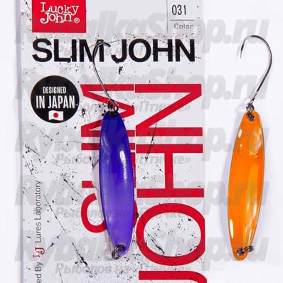 Slim John  - новинка 2017 года - cерия колеблющихся блёсен, разработанная японскими специалистами по заказу компании Lucky John для любителей ловли речной форели. Блесны Lucky John Slim John имеют узкую вытяную форму и небольшую площадь по отношению к весу приманки, что позволяет далеко и точно её забрасывать, а приманке прекрасно держать даже самую сильную струю. В то же время приманка работает на платных форелевых прудах. Позволяет быстро обловить участок на скоростной проводке. Лучше всего ловит активную форель. Активная игра Slim John по достоинству будут оценены также любителями ловли головля на перекатах, использующими спиннинговые снасти ультралёгкого и лёгкого классов. Оснащаются блесны Slim John одинарным безбородочным крючком.