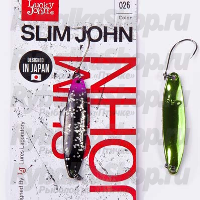 Slim John - новинка 2017 года - cерия колеблющихся блёсен, разработанная японскими специалистами по заказу компании Lucky John для любителей ловли речной форели. Блесны Lucky John Slim John имеют узкую вытяную форму и небольшую площадь по отношению к весу приманки, что позволяет далеко и точно её забрасывать, а приманке прекрасно держать даже самую сильную струю. В то же время приманка работает на платных форелевых прудах. Позволяет быстро обловить участок на скоростной проводке. Лучше всего ловит активную форель. Активная игра Slim John по достоинству будут оценены также любителями ловли головля на перекатах, использующими спиннинговые снасти ультралёгкого и лёгкого классов. Оснащаются блесны Slim John одинарным безбородочным крючком.