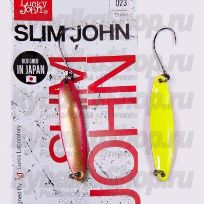 Slim John  - новинка 2017 года - cерия колеблющихся блёсен, разработанная японскими специалистами по заказу компании Lucky John для любителей ловли речной форели. Блесны Lucky John Slim John имеют узкую вытяную форму и небольшую площадь по отношению к весу приманки, что позволяет далеко и точно её забрасывать, а приманке прекрасно держать даже самую сильную струю. В то же время приманка работает на платных форелевых прудах. Позволяет быстро обловить участок на скоростной проводке. Лучше всего ловит активную форель. Активная игра Slim John по достоинству будут оценены также любителями ловли головля на перекатах, использующими спиннинговые снасти ультралёгкого и лёгкого классов. Оснащаются блесны Slim John одинарным безбородочным крючком.