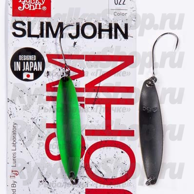 Slim John  - новинка 2017 года - cерия колеблющихся блёсен, разработанная японскими специалистами по заказу компании Lucky John для любителей ловли речной форели. Блесны Lucky John Slim John имеют узкую вытяную форму и небольшую площадь по отношению к весу приманки, что позволяет далеко и точно её забрасывать, а приманке прекрасно держать даже самую сильную струю. В то же время приманка работает на платных форелевых прудах. Позволяет быстро обловить участок на скоростной проводке. Лучше всего ловит активную форель. Активная игра Slim John по достоинству будут оценены также любителями ловли головля на перекатах, использующими спиннинговые снасти ультралёгкого и лёгкого классов. Оснащаются блесны Slim John одинарным безбородочным крючком.