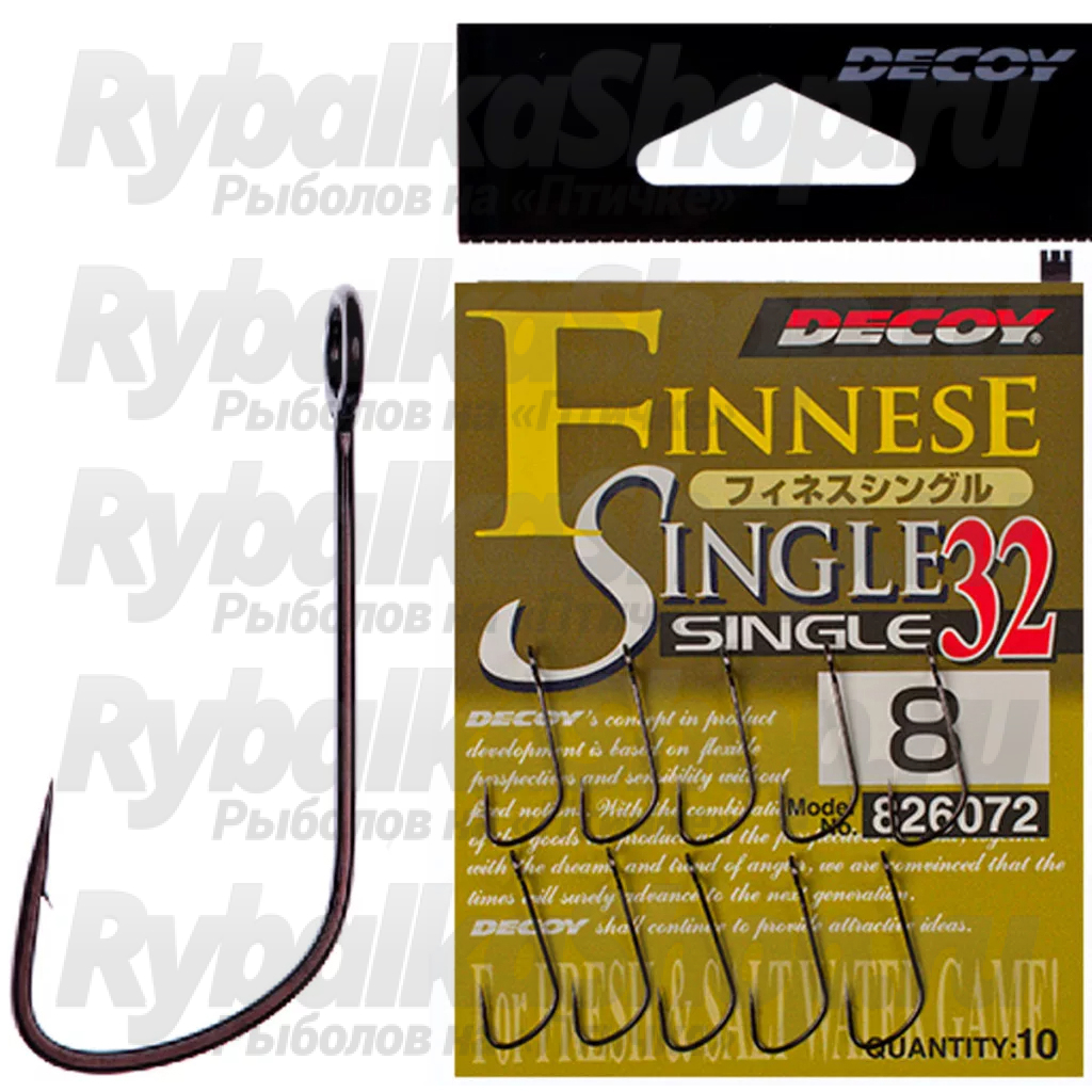 Крючок Decoy Single 32 предназначен для оснащения силиконовых приманок при ловле хищной рыбы. Что примечательно, форма крючка была разработана в сотрудничестве с отечественными рыболовами-спортсменами, которые считаются одними из лучших спиннингистов в мире. Правильно подобранная толщина проволоки и особый изгиб, позволяют приманке лучше удерживаться на крючке и рыбе значительно сложнее стащить её. Также, такая форма способна выдержать большие нагрузки и меньше подвержена разгибанию. Single 32 имеет увеличенное ушко для большей свободы при осуществлении проводки.